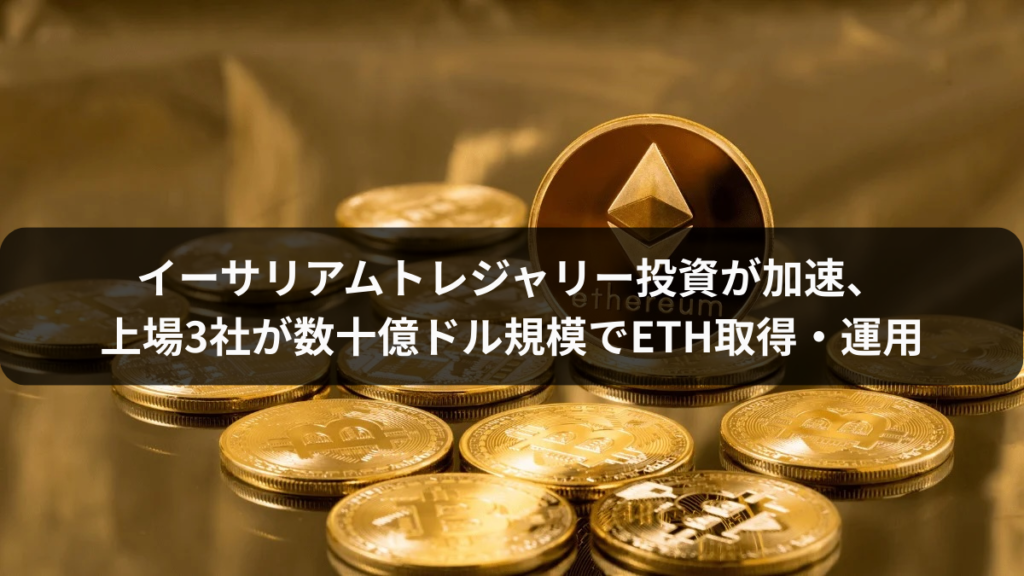 上場企業によるイーサリアム投資が急速に拡大しており、すでに数十億ドル規模に達しています。米国の大手上場企業を中心に、ETHの大規模購入や運用戦略の多様化が進んでいます。