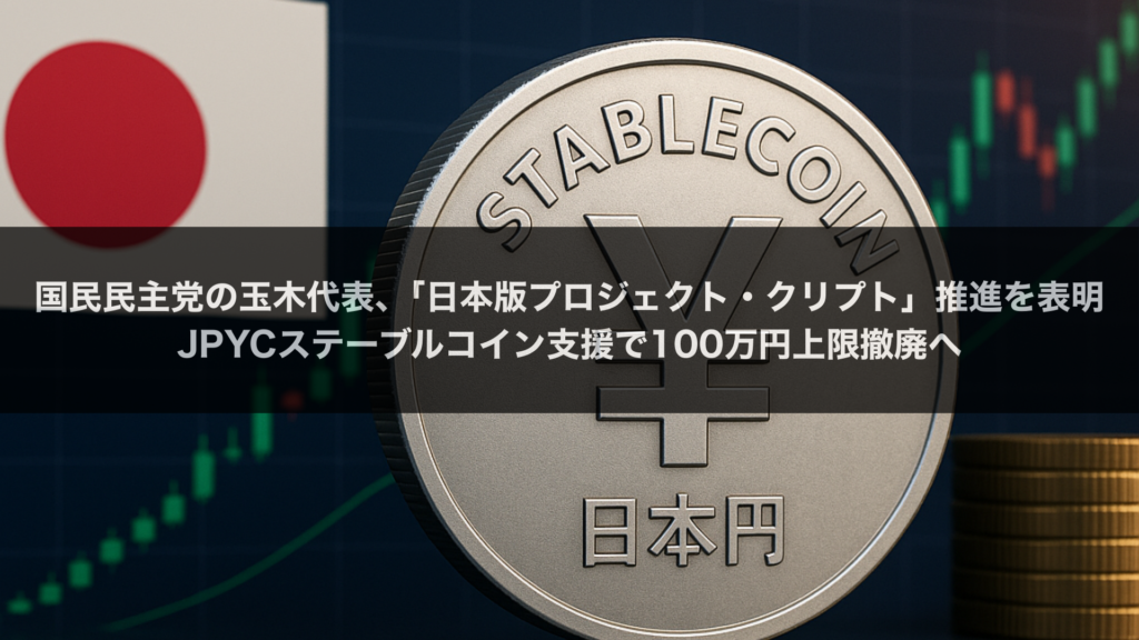 国民民主党の玉木代表が、日本円ステーブルコイン「JPYC」への政策支援を正式表明し、「日本版プロジェクト・クリプト」の推進を宣言しました。JPYC株式会社の資金移動業登録取得を受け、ステーブルコイン普及の最大の障壁である「100万円送金上限」の撤廃に向けた政策的後押しが期待されます。米国の「プロジェクト・クリプト」に対抗する日本独自の戦略により、円建てデジタル資産の国際競争力強化が本格化する見通しです。