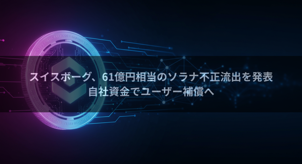 スイスに拠点を置く仮想通貨プラットフォーム「スイスボーグ」で、ソラナ(SOL)の大規模な不正流出が発生しました。流出額は約4,100万ドル(約61億円)に達するとされ、同社は自社資金を用いてユーザーへの補償を行う方針を示しています。